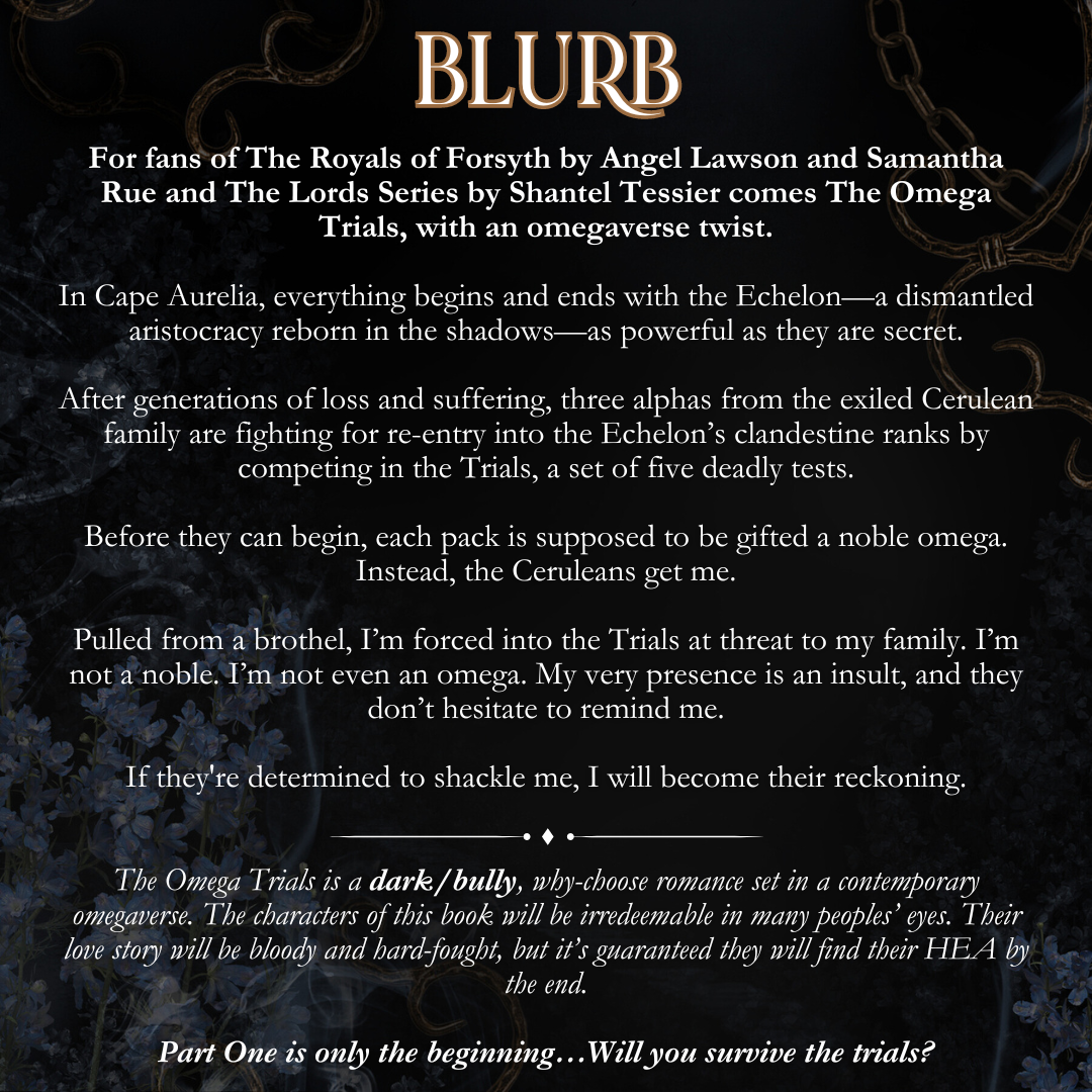 The Omega Trials is a dark/bully, why-choose romance set in a contemporary omegaverse. The characters of this book will be irredeemable in many peoples’ eyes. Their love story will be bloody and hard-fought, but it’s guaranteed they will find their HEA by the end.